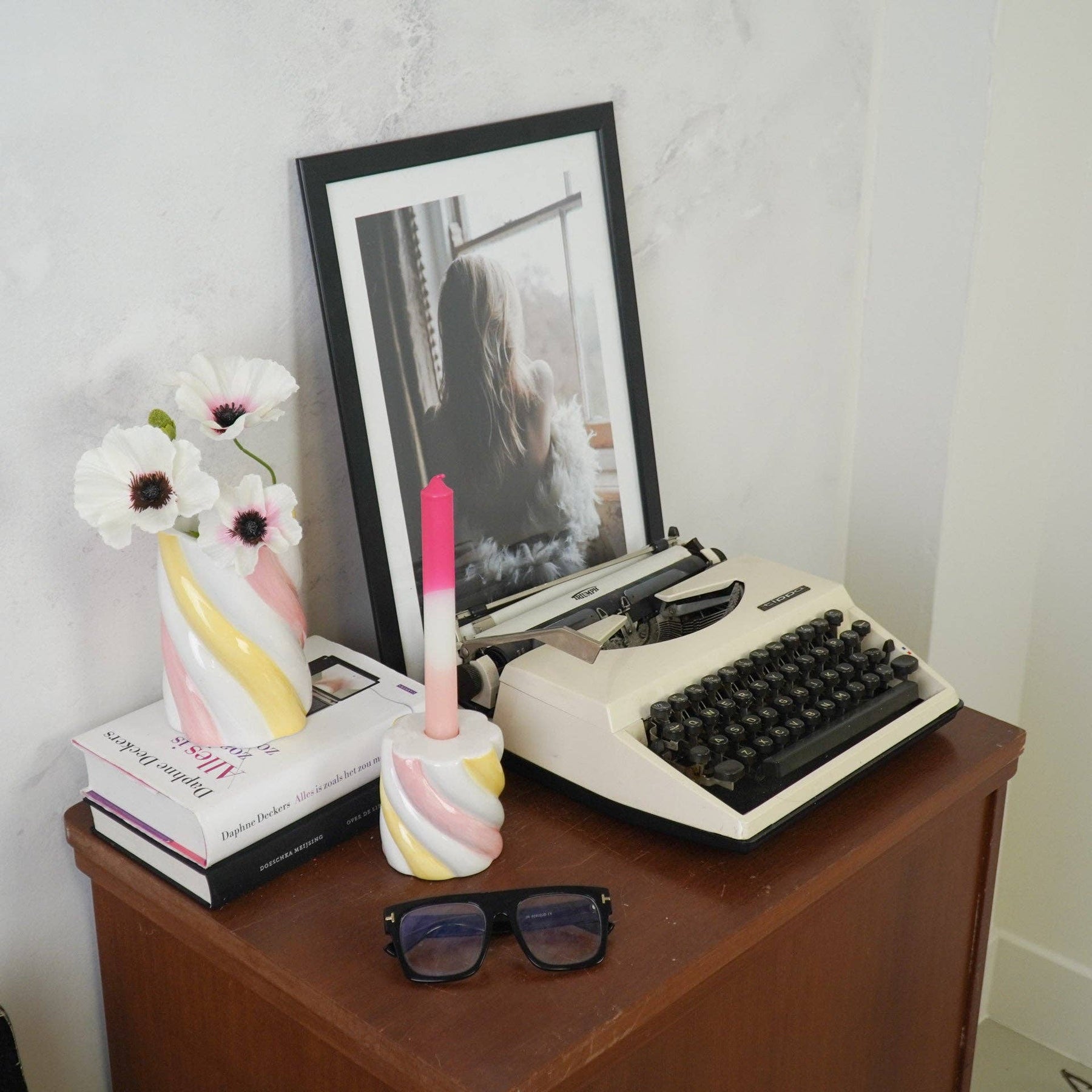 Der Kerzenhalter „Marshmallow“ überzeugt mit seiner weich gedrehten Form und einer harmonischen Farbkombination aus Gelb, Rosa und Weiß. Das Design erinnert dezent an einen gedrehten Marshmallow und bringt eine verspielte Leichtigkeit in den Raum – ohne aufdringlich zu wirken.